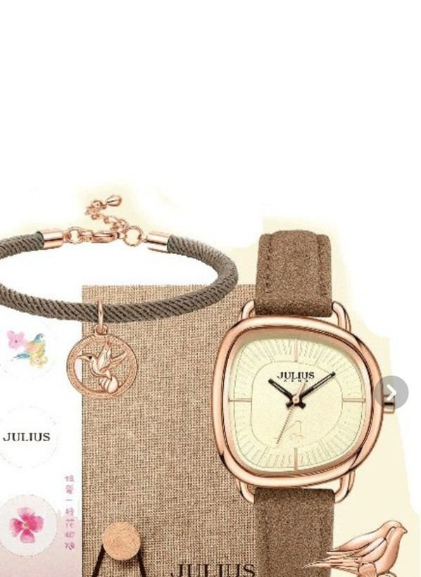 در این مدل از ساعت جلیوس طراحی صفحه به شکل نامنظمی انجام شده ،که باعث زیبایی چشمگیری میشود و همچنین در کنار ساعت دستبندی با نماد پرنده قرار میگیرد و همان نماد پرنده در صفحه ساعت نیز دیده میشود و علاوه براین این نماد به صورت قطعهای از اصالت به روی بند ساعت چشم نوازی میکند
